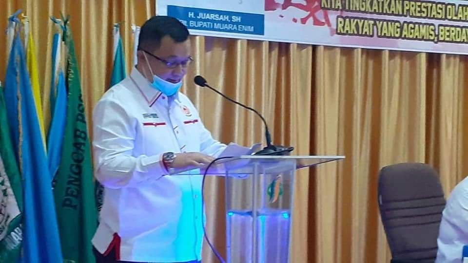 “Terlebih telah sama-sama kita maklumi bahwa prestasi Kabupaten Muara Enim pada PORPROV XII SUMSEL Tahun 2019 di Prabumulih belum begitu menggembirakan. Muara Enim baru mampu meraih 80 medali yang terdiri atas 19 emas, 24 perak, dan 37 perunggu. Raihan medali ini hanya mampu menempatkan kabupaten ini pada peringkat ke-8,”ungkap Hendri dalam sambutannya.