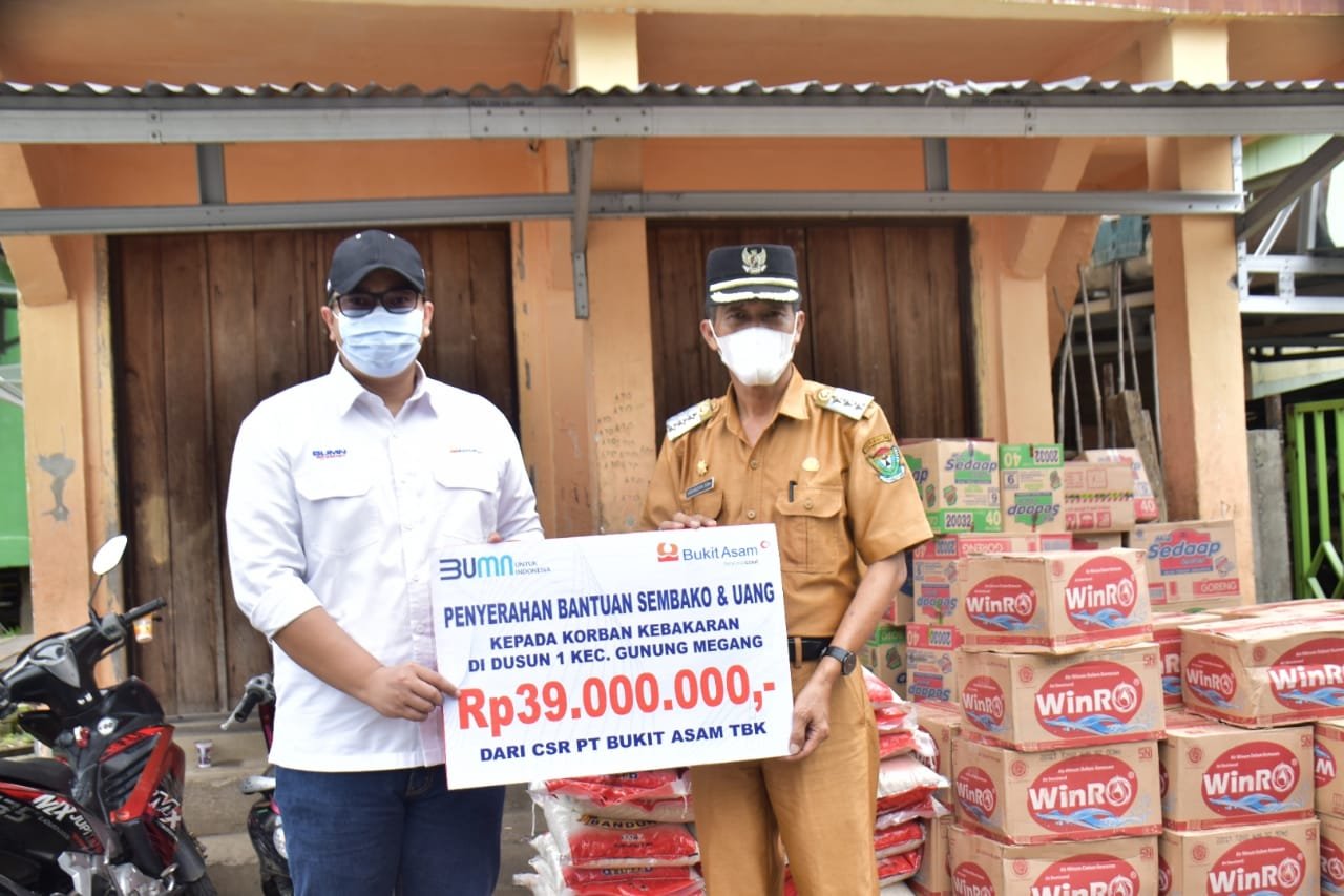 Mewakili Manajemen PTBA, Senior Manajer Corporate Social Responsibility (CSR) PTBA Hartono didampingi Asisten Manajer Bina Lingkungan CSR PTBA Hartoyo bersama Pj Bupati Muara Enim Dr H Nasrun Umar SH MM didampingi Camat Gunung Megang Ardiansyah langsung menyalurkan bantuan kepada korban kebakaran.