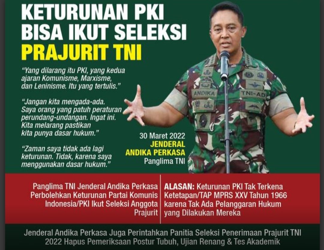 Jakarta, Pojoksumsel.com – Sebelumnya pada, Kamis (31/03), Panglima TNI Jenderal TNI Andika Perkasa mengizinkan anak cucu keturunan anggota Partai Komunis Indonesia untuk mendaftar Seleksi Penerimaan anggota TNI dari berbagai jenjang, mulai dari Tamtama, Bintara, Akademi TNI ataupun prajurit karir.